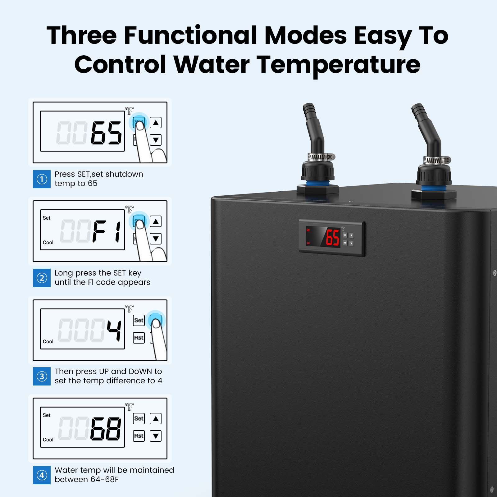 - Efficient, stable, and precise cooling: This 1/2 hp water chiller is designed for ice baths, aquariums, and hydroponics. With a high-efficiency energy-saving compressor that maintains a temperature of 50°F-55°F (10°C-12°C), it ensures that your ice stays cold for longer, allowing you to enjoy the benefits of cold therapy.Utilizing automatic constant temperature control and efficient circulation refrigeration technology with r134a refrigerant, it maintains water temperature between 68°F-79°F (20°C-26°C), creating a comfortable environment for aquatic life.