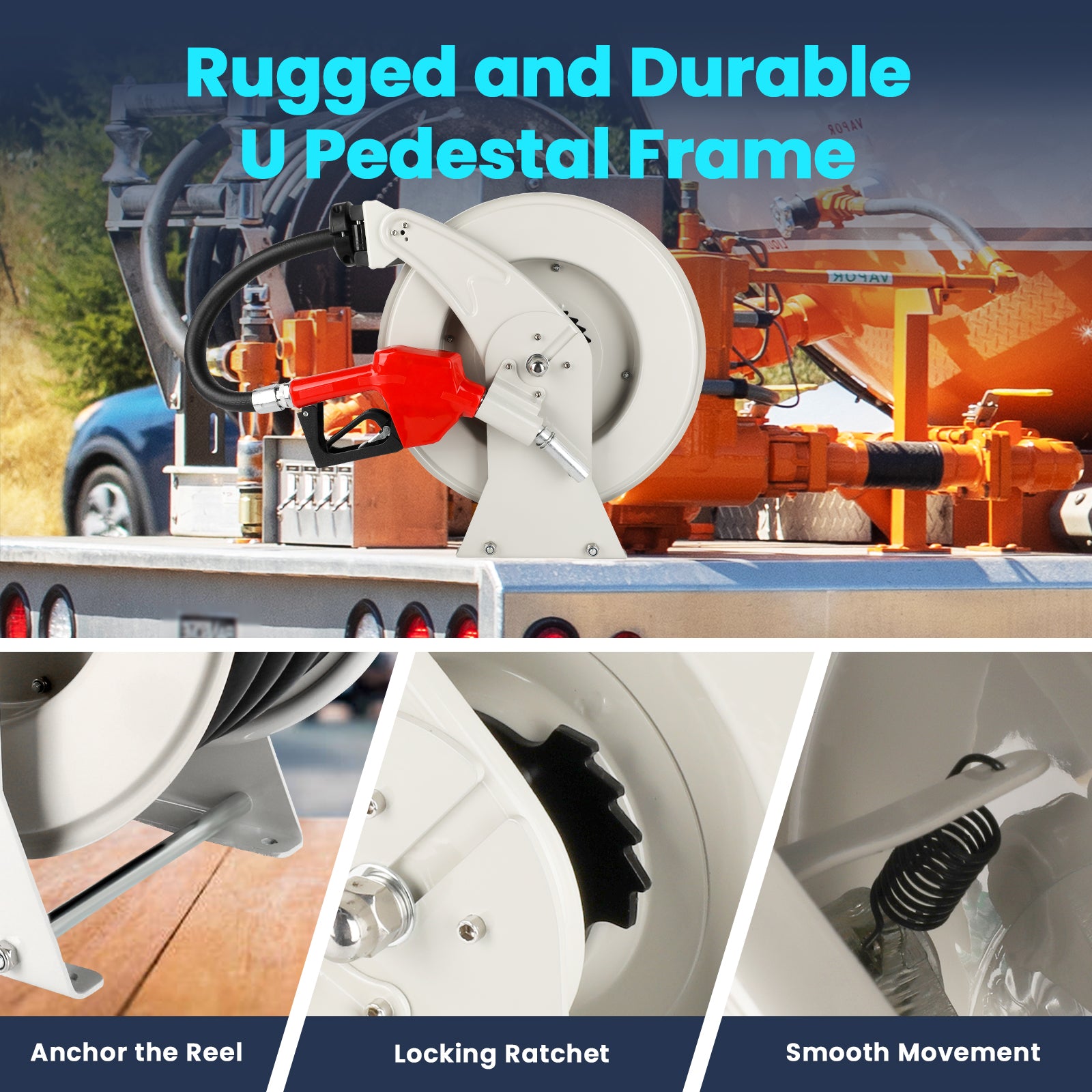 Substantial Base Frame Fuel Reel: There are discs on both-side with reinforced flanged edges, heat-treated with powder coating, robust and resistant to corrosion. And the U-style pedestal with 4 reinforcement drilled holes to anchor the reel securely to provide stability and reliability. This construction results in the fuel hose reel that can handle the rigors of being utilized on a job site or in an industrial environment.