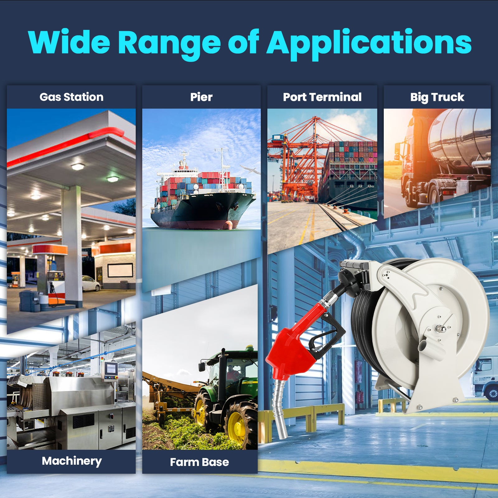 Easy Maintenance: All seals are made from Solid Brass(CuZn40Pb2) for compatibility with diesel fuel, ensuring smooth, uninterrupted fluid flow without fuel leaking. Including a 360° rotating connection seals to prevent the hose from twisting when refueling, and ensure that the fuel nozzle is not moving and not easy to leak. The reel is well-suited to all industries including Agriculture, Industrial, Mining and Transportation, great for onsite refueling.