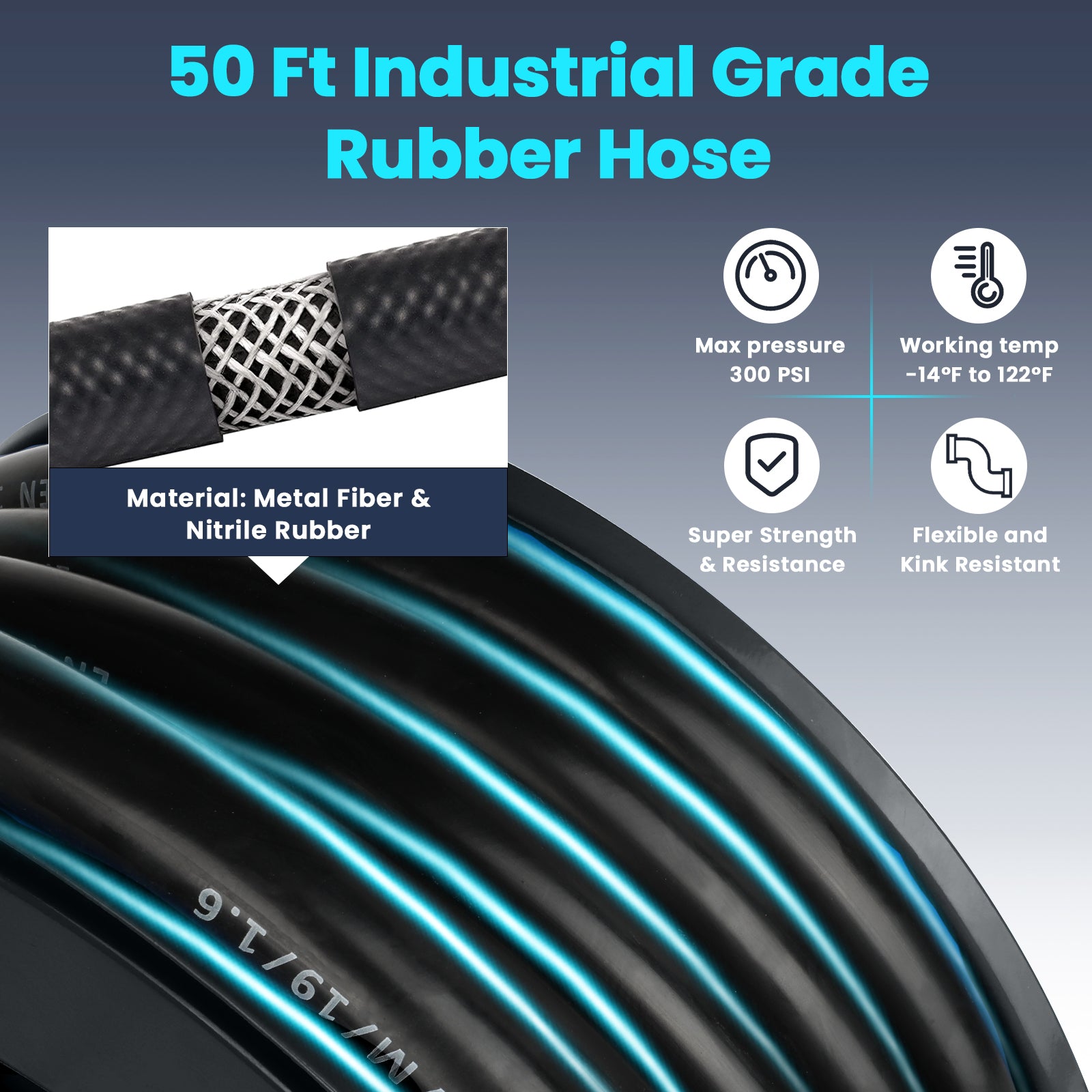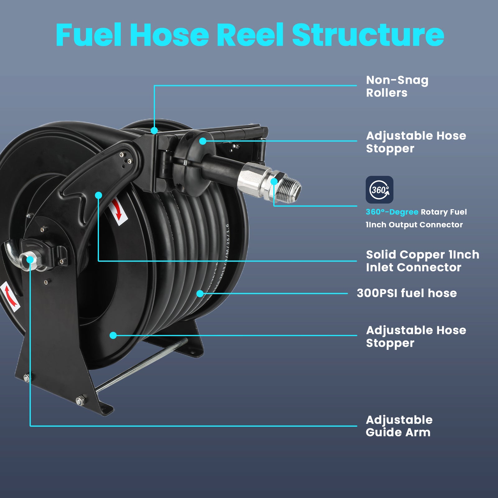Fuel Hose holder with 50ft Hose: Coming with an industrial-grade rubber hose, strength and bending flexibility, resistance to abrasion, heat, ozone, and can work in the toughest conditions -14°F to 122°F. 50 feet in length, 1'' diameter hose gives you extra length to work with. Also, rated to a maximum pressure of 300 PSI, capable of delivering fast flows & precision volumes of fuel, diesel or kerosene, etc.