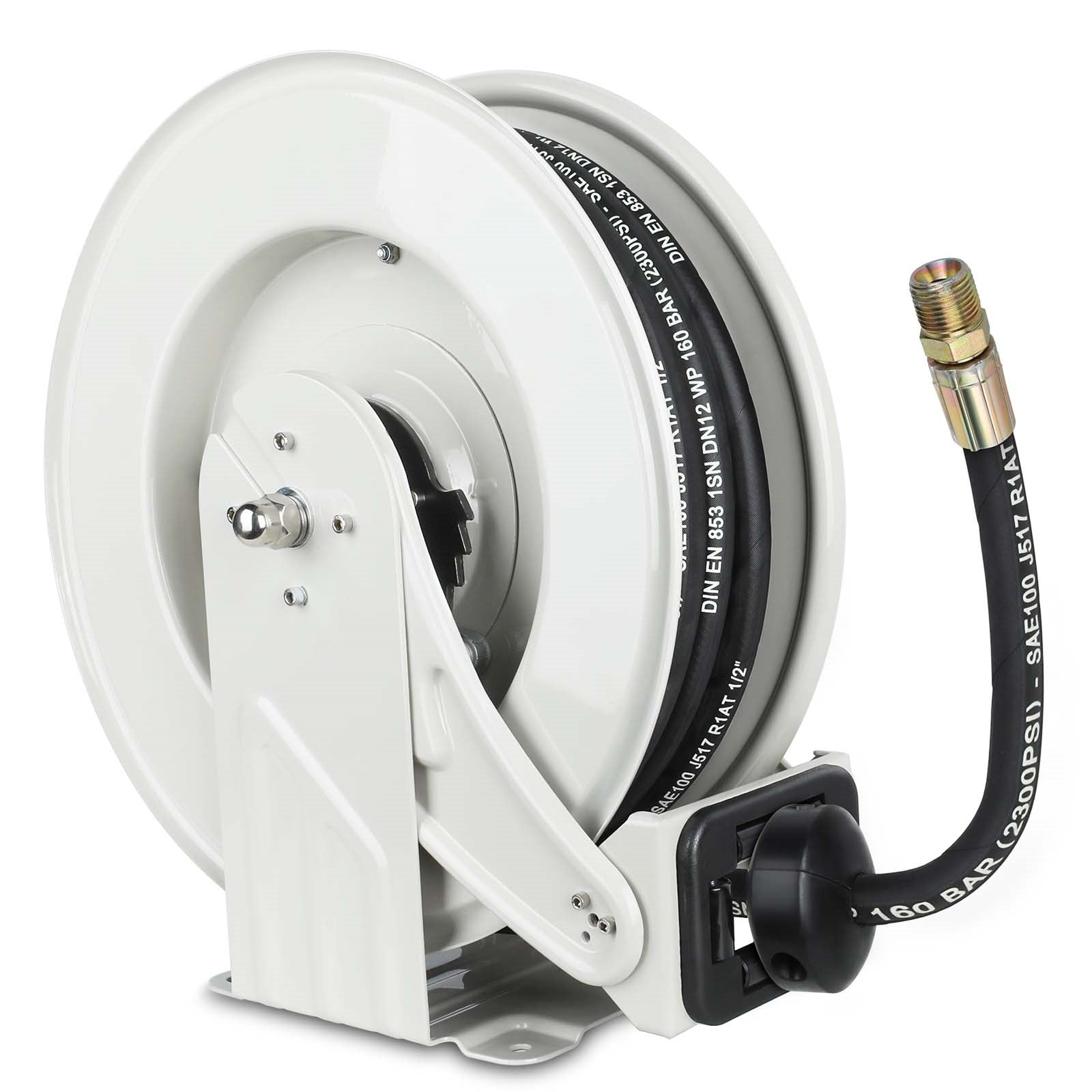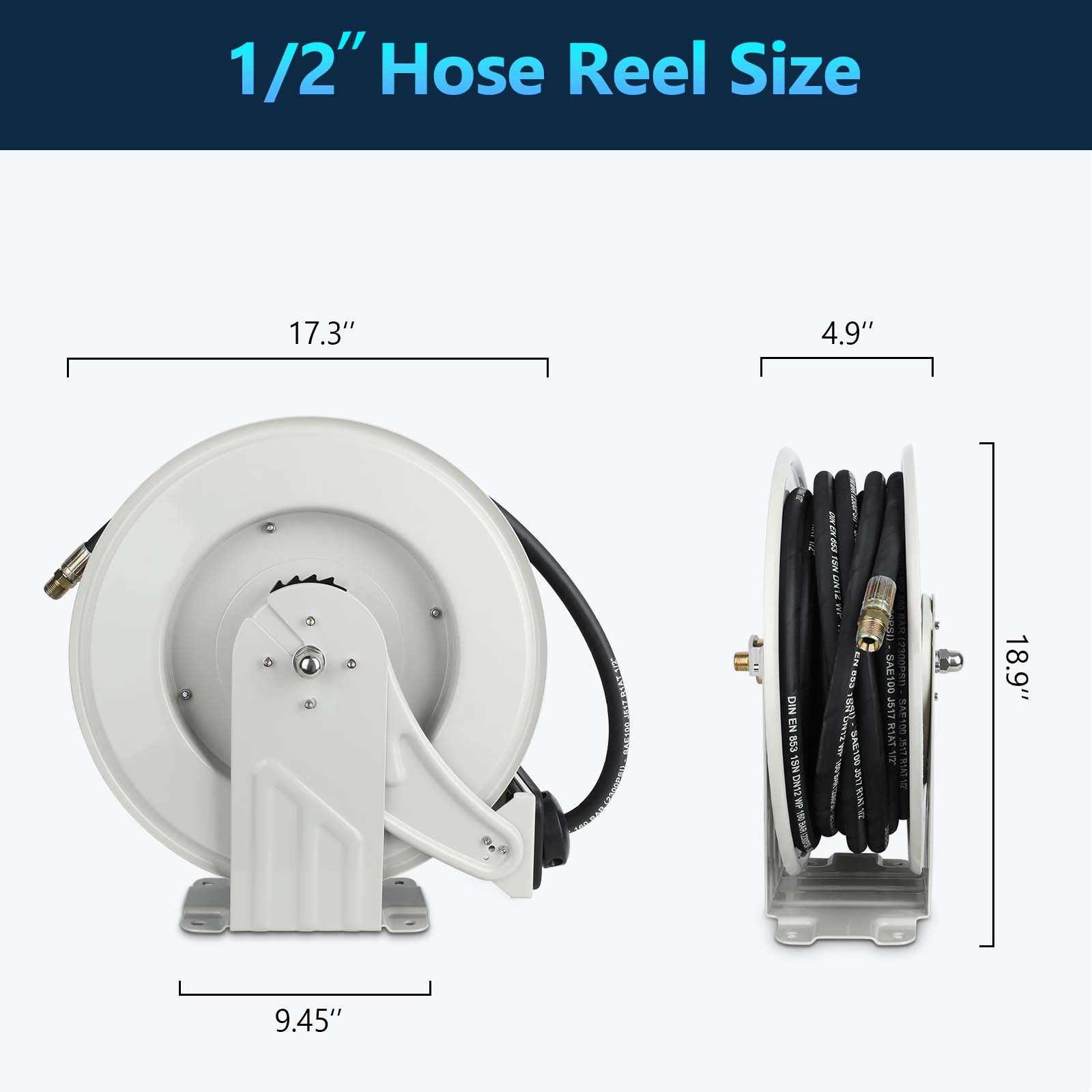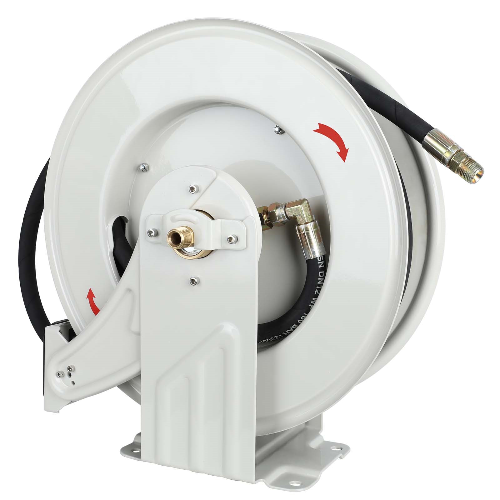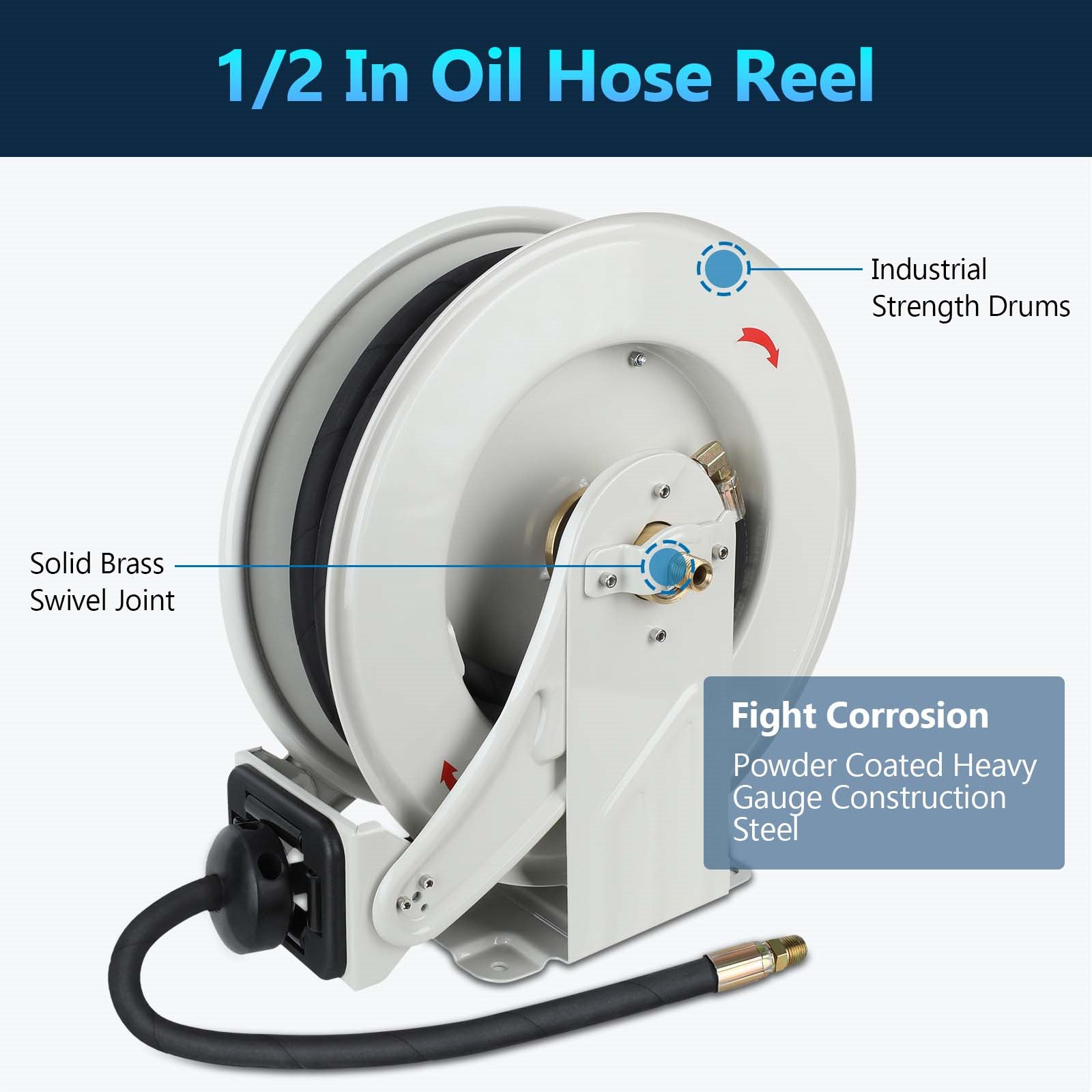 SAFETY and PROPER USE - Our Reels are cull quality tested; It is best suited for indoor/outdoor use, night or day, DIY or industrial applications allowing for extension to be up out of the way keeping the home/workplace safe; Includes bolts fitting the 1/2” inch (12.7mm) holes to mount, (lead-in hose not included); Oil Hose Reels are suitable for Petroleum and Water based hydraulic fluids (NOT AIR)