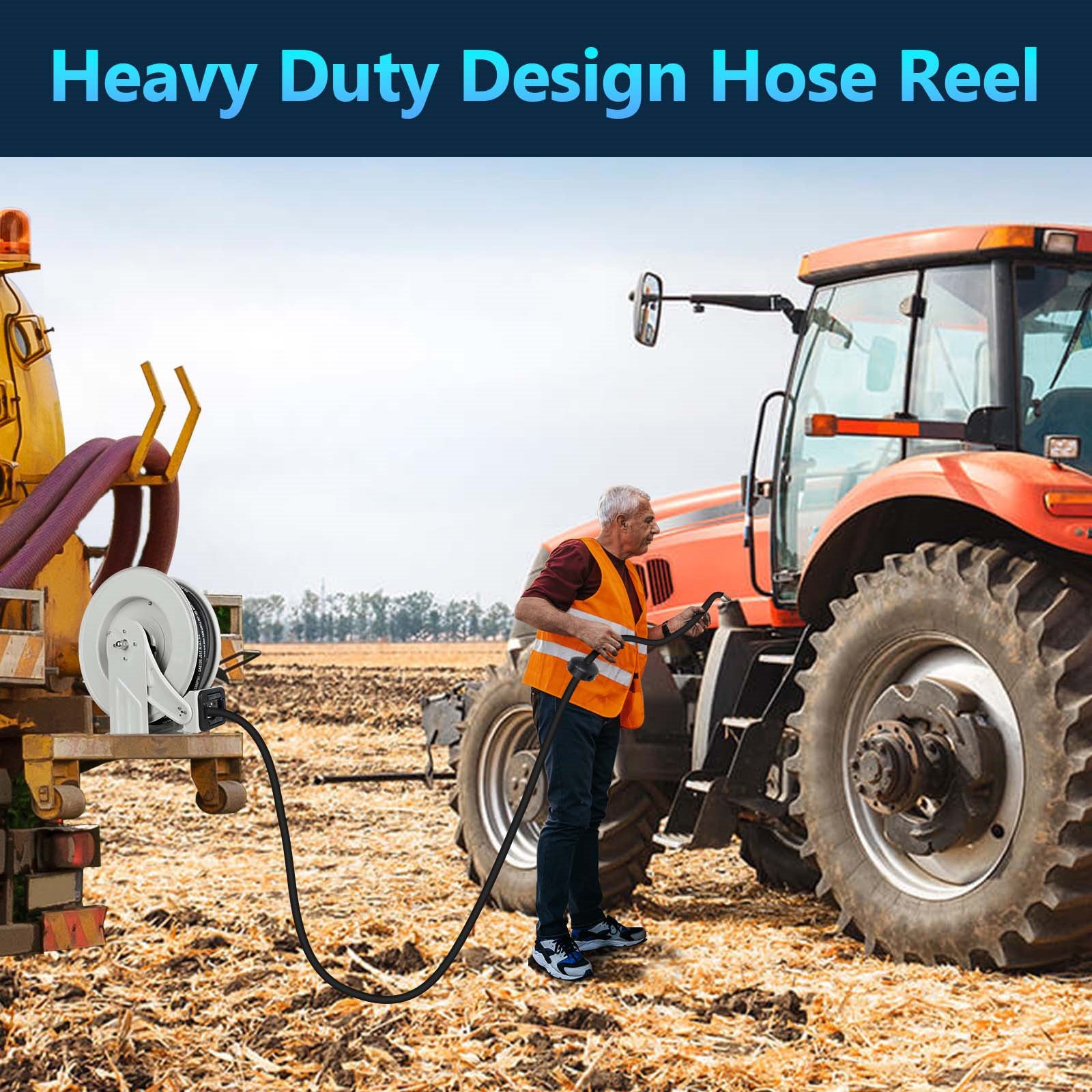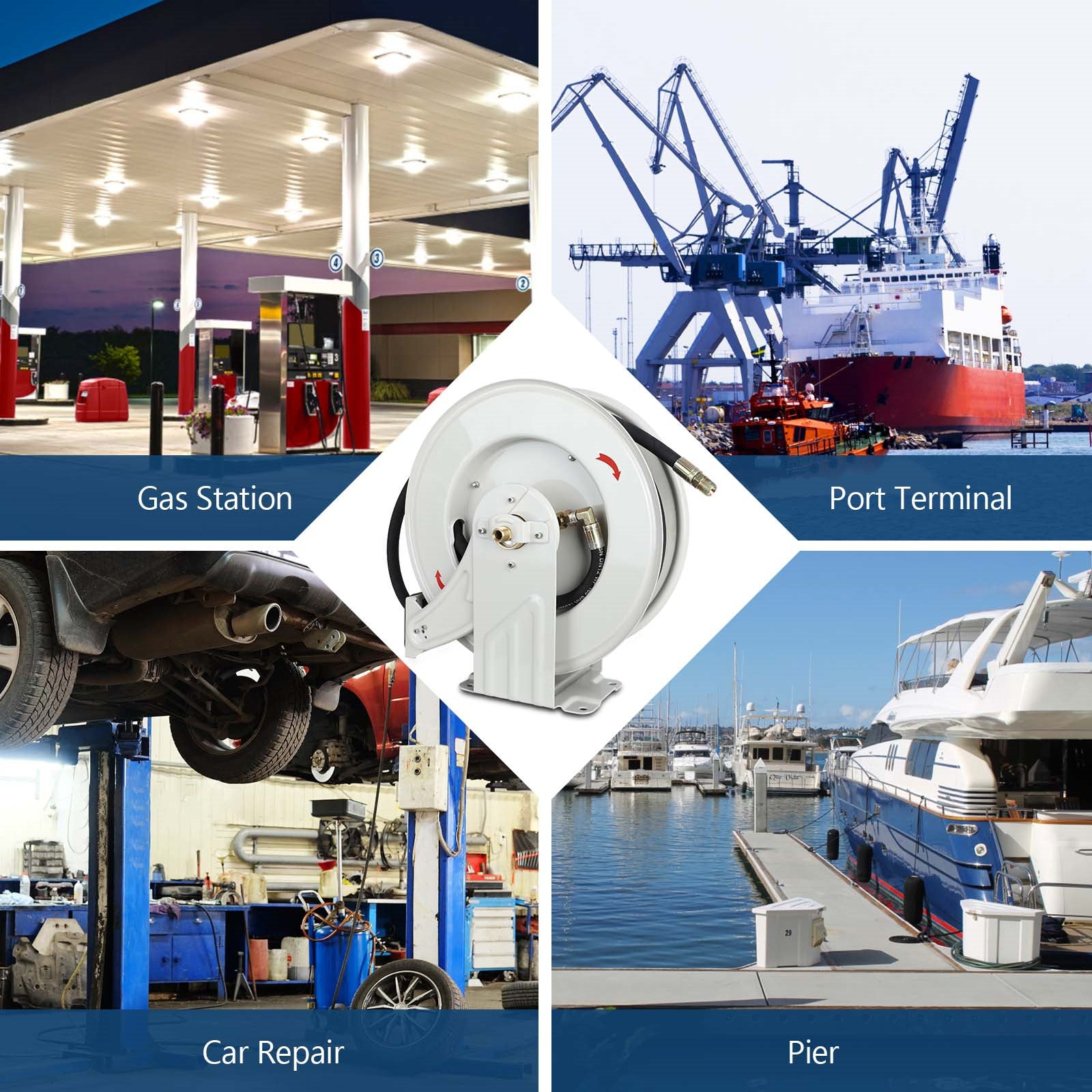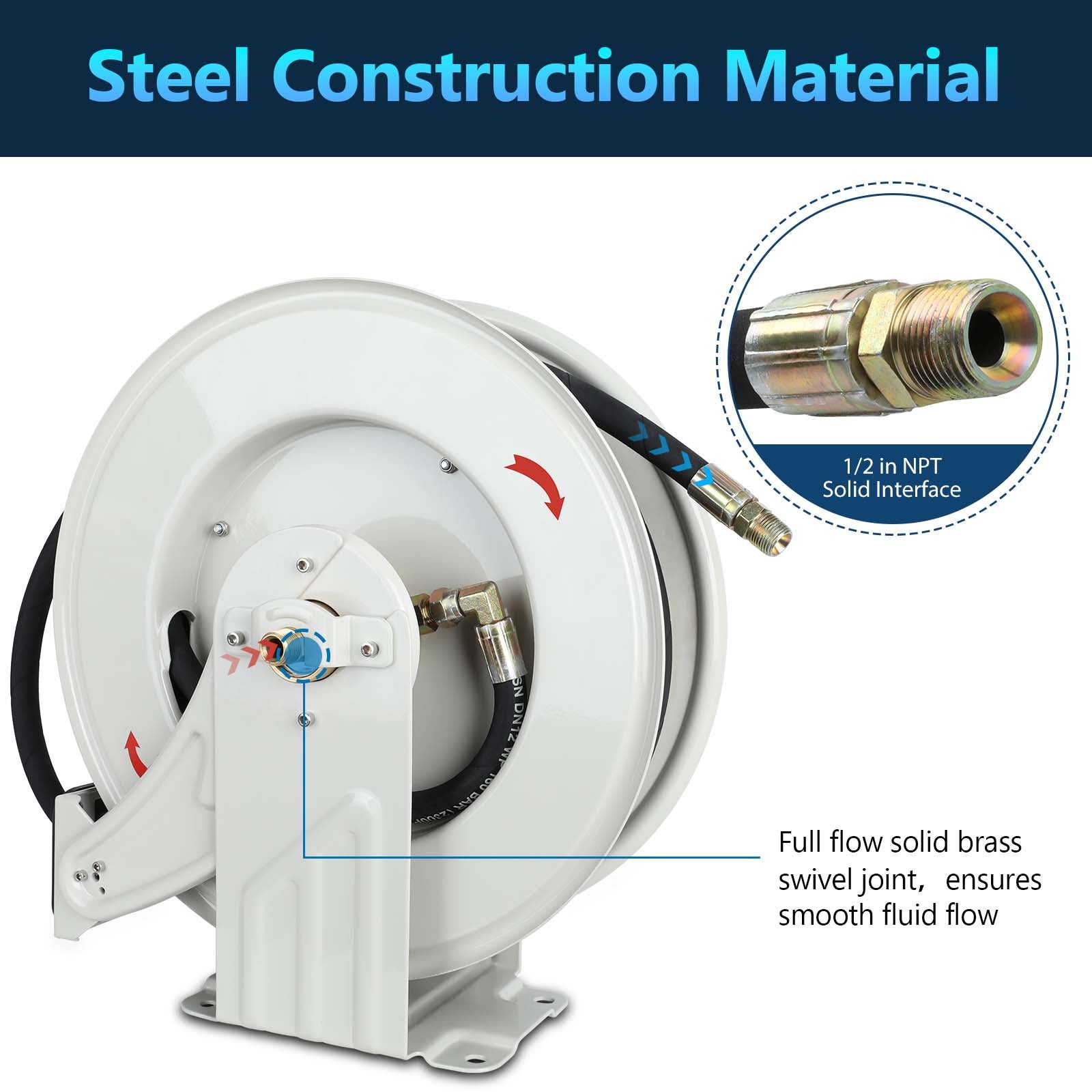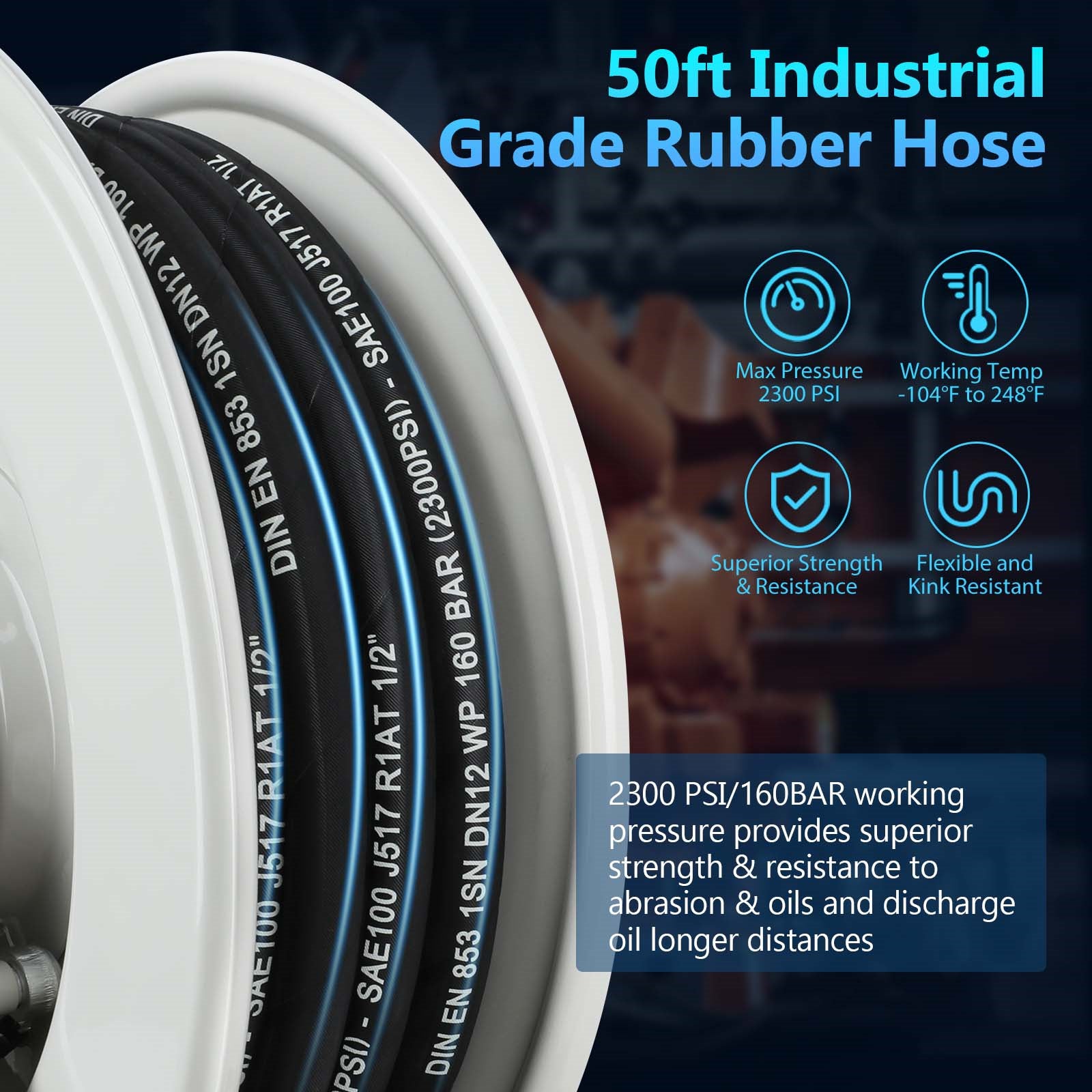SAFETY and PROPER USE - Our Reels are cull quality tested; It is best suited for indoor/outdoor use, night or day, DIY or industrial applications allowing for extension to be up out of the way keeping the home/workplace safe; Includes bolts fitting the 1/2” inch (12.7mm) holes to mount, (lead-in hose not included); Oil Hose Reels are suitable for Petroleum and Water based hydraulic fluids (NOT AIR)