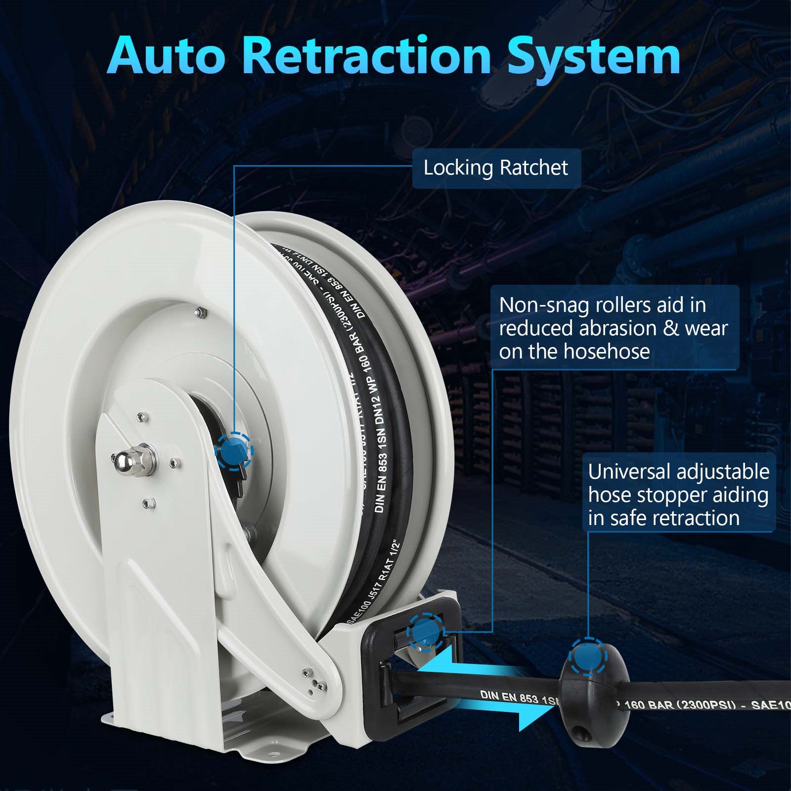 PRODUCT INTEGRITY - Utilizing double adjustment enclosed multi-position release ratchet spring, locking the hose at any desired length; Ball bearing swivel joint inlet connection protecting against leaks; reducing swivel spool and body friction, an Adjustable Hose Stopper and Non-Snag Rollers; Premium SAE100R1AT Hose is Resistant to: Oils, acids, puncture resistance, abrasion, weather and works in the toughest conditions of -40°F to 212°F (-40°C to 100°C), for the best advantage